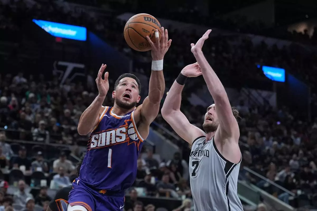 2026年3月19日周四,鳳凰城太陽隊後衛迪雲布加(Devin Booker)(1號) 在聖安東尼奧(San Antonio)對陣聖安東尼奧馬刺隊(San Antonio Spurs)的NBA籃球賽上半場,突破聖安東尼奧馬刺隊中鋒盧克哥尼特(Luke Kornet)(7號) 的防守。(美聯社圖片/Eric Gay) AP圖片