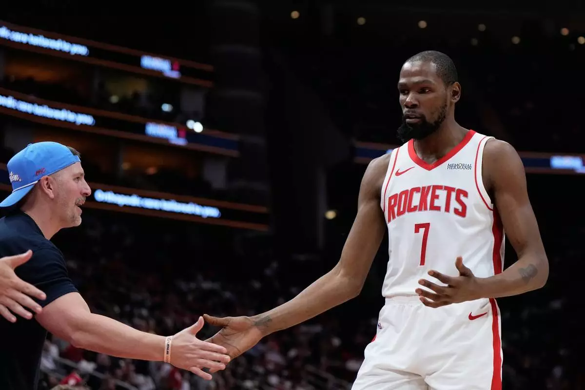 2026年3月21日周六,侯斯頓火箭前鋒杜蘭特(7號)在侯斯頓對陣邁阿密熱火的NBA籃球賽下半場,向球迷致意。 (美聯社圖片/Ashley Landis) AP圖片