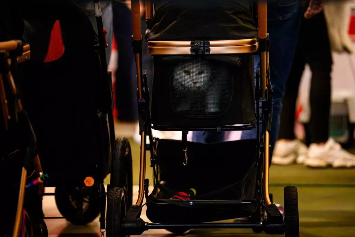 一隻貓在羅馬尼亞布加勒斯特舉行的「貓咪奧斯卡」國際貓咪選美大賽評審環節前,坐在嬰兒車內。該比賽於2026年3月21日(周六)舉行,吸引逾200隻貓咪參與。(美聯社圖片/Andreea Alexandru) AP圖片