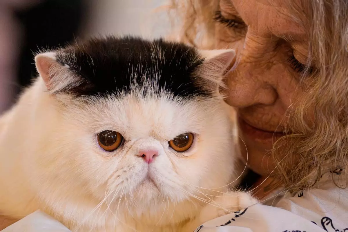 2026年3月21日周六,羅馬尼亞布加勒斯特舉行一場國際貓隻選美大賽,被譽為「貓界奧斯卡」,吸引逾200隻貓咪參與。圖為一名女子在評審環節中抱著一隻貓。(美聯社圖片/Andreea Alexandru) AP圖片