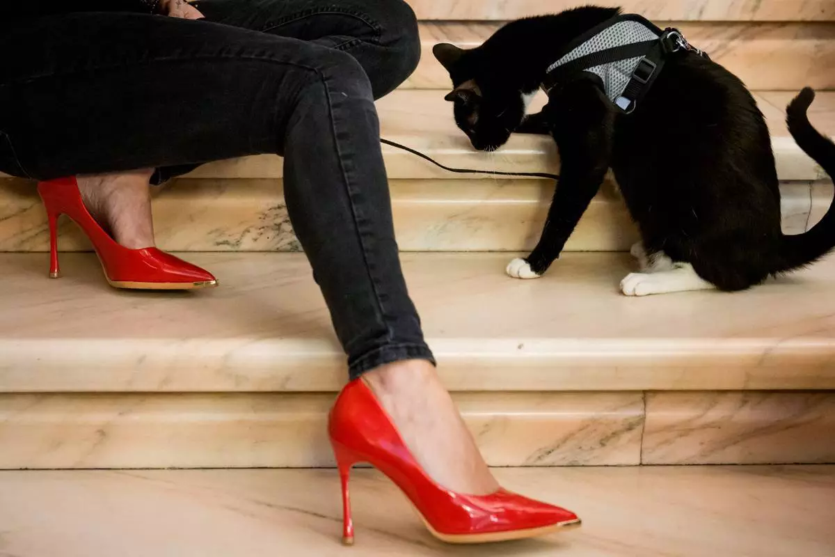 一隻名為布里圖(Burrito)的流浪貓,在羅馬尼亞布加勒斯特舉行的「貓咪奧斯卡」國際貓咪選美大賽上,坐在一女子旁邊。布里圖被用於動物救援組織推廣寵物領養。該比賽於2026年3月21日(周六)舉行,吸引逾200隻貓咪參與。(美聯社圖片/Andreea Alexandru) AP圖片
