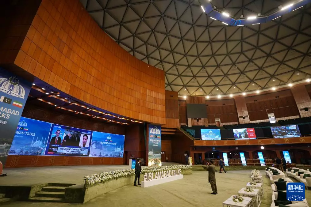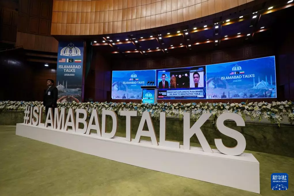 美國和伊朗11日在巴基斯坦首都伊斯蘭堡舉行談判,圖為現場的傳媒中心。新華社