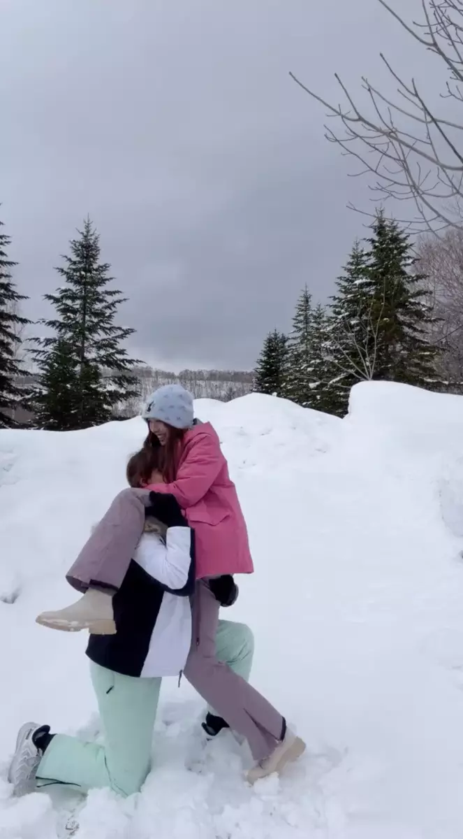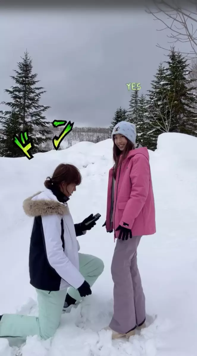 許倚榕早前在社交平台晒出張明偉在雪地單膝下跪的影片。