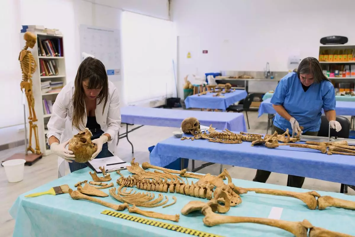 2026年3月3日周二,法醫人類學家瑪麗埃拉·富馬加利(Mariella Fumagalli,左)和加布里埃拉·吉迪尼(Gabriela Ghidini),在阿根廷布宜諾斯艾利斯(Buenos Aires)的阿根廷法醫人類學團隊實驗室中,檢驗軍事獨裁時期被謀殺和失蹤者的骨骸。 (美聯社圖片/羅德里戈·阿卜德 Rodrigo Abd) AP圖片