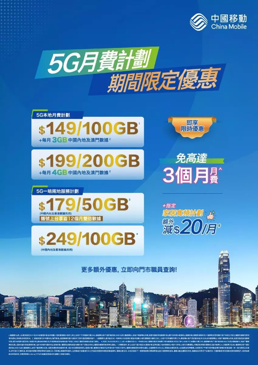 由即日起至本月底,新號碼及轉台客戶簽約24個月選用「5G一咭兩地」計劃,即可獲得高達3個月免月費優惠。月費179元的50GB中港數據計劃可享兩個月免費;而月費249元或以上的100GB及200GB高用量計劃,更可獲贈三個月免月費。計劃支援兩地數據共用,客戶可安心使用各類香港常用應用程式,讓大灣區生活及消費更加輕鬆便捷。