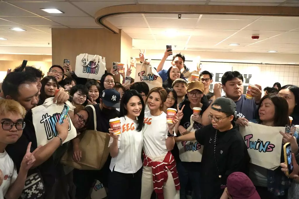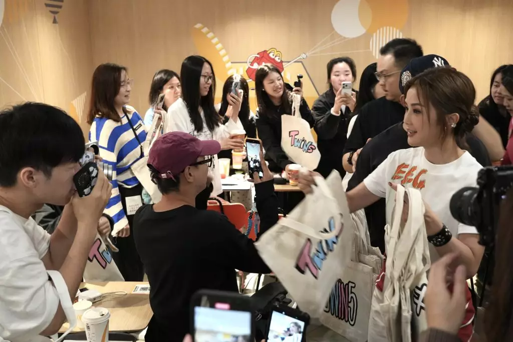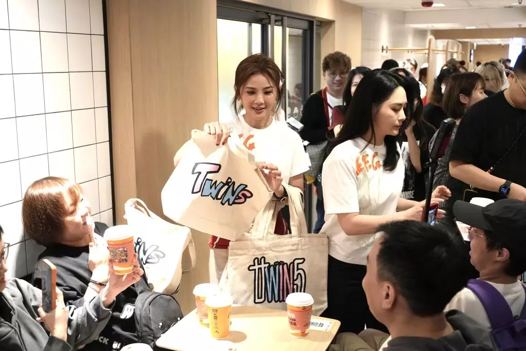 除了派奶茶,Twins更十分有心思,特別準備了,Twins 親自設計,印有「TWINS」Graffiti圖案的tote bag及小卡送給fans。二人默契十足,一個負責派奶茶,另一個派 tote bag,實行要粉絲又有得飲又有得拎,滿載而歸。最後全場更一齊大合照,場面溫馨又熱鬧。