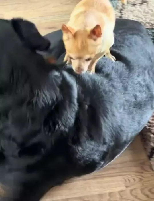 影片可見,這隻吉娃娃犬體型遠較其他羅威納犬細小,但氣勢卻絲毫不輸大狗。影片可見,吉娃娃犬神態從容站在其中一隻羅威納犬身上,環顧四周的模樣極具自信,猶如是這班大狗的真正「大佬」。