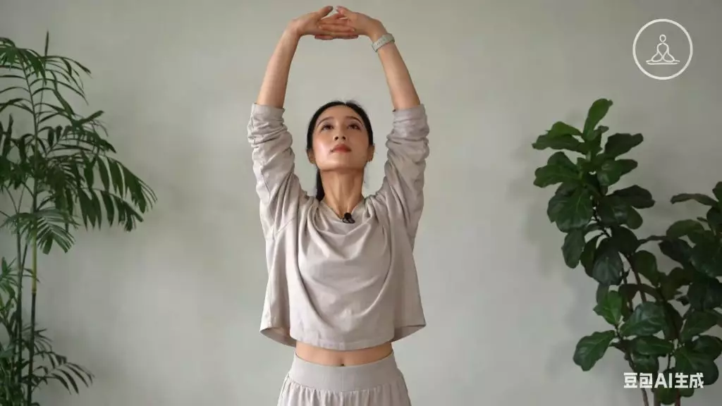 雙手十指交扣向上伸展,再慢慢打開胸口,有助舒展胸脅、放鬆肩頸。