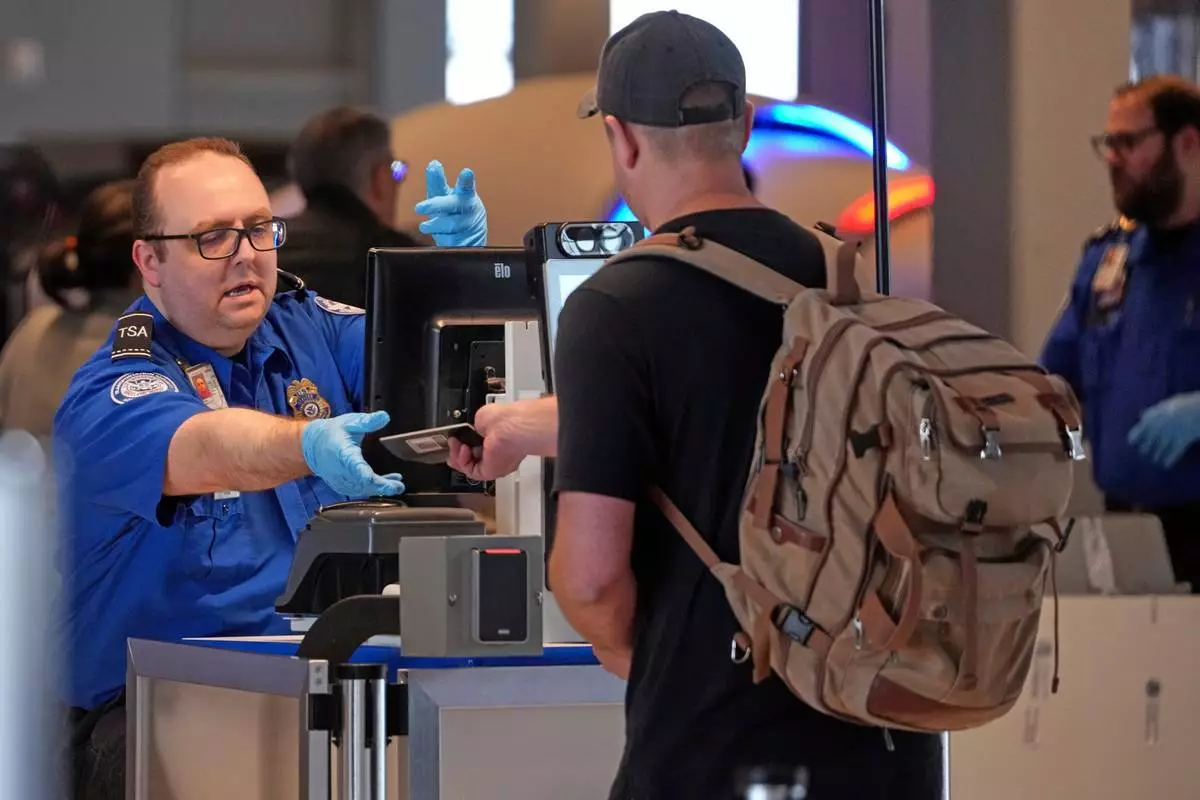 2026年3月23日周一,一名運輸安全管理局職員在賓夕法尼亞州帝國市匹茲堡國際機場(Pittsburgh International Airport)的運輸安全管理局安檢站將護照交還給旅客。(美聯社圖片/Gene J. Puskar) AP圖片