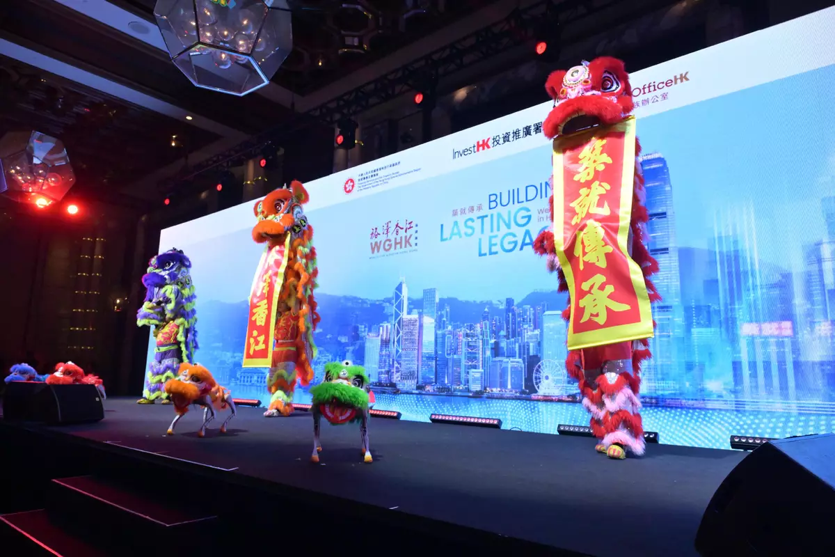 晚宴由一場別開生面的「人機共舞醒獅」表演揭開序幕,傳統醒獅與靈活敏捷的機械狗合作,為出席的家族辦公室決策人帶來視覺盛宴。 政府新聞處圖片