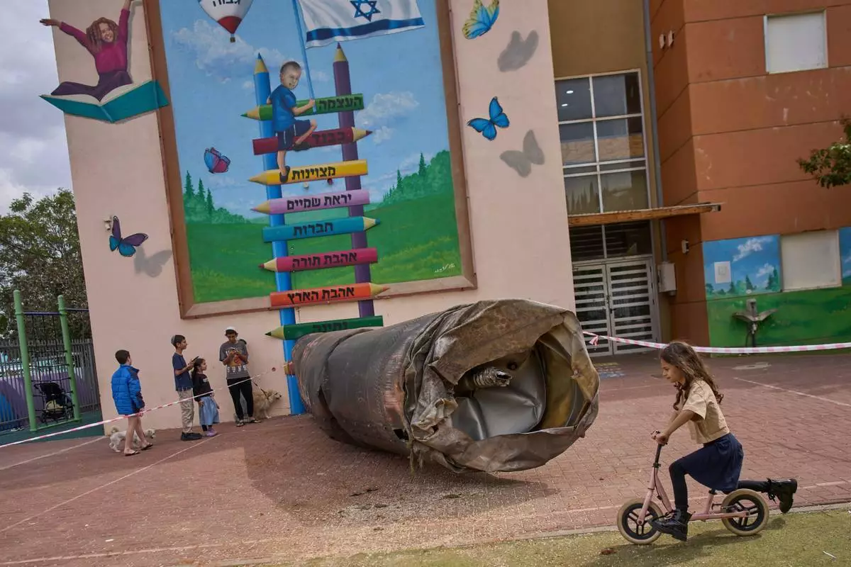 2026年3月23日周一,約旦河西岸以色列定居點佩杜埃勒的一所學校操場上,兒童們在一枚伊朗彈道導彈碎片旁玩耍。(美聯社圖片/Ohad Zwigenberg) AP圖片