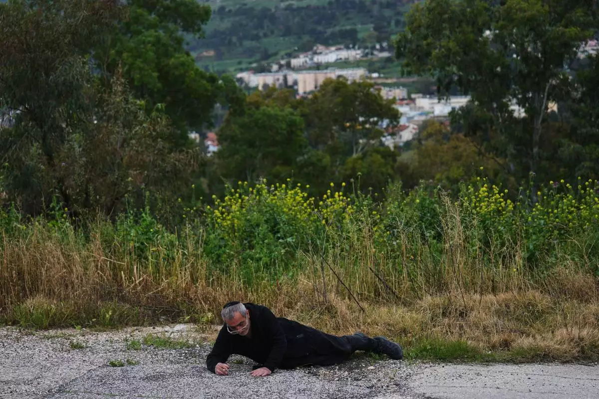 2026年3月23日周一,以色列北部謝莫納,一名男子在空襲警報響起時尋找掩護,警報警告有火箭從黎巴嫩射向以色列。(美聯社圖片/Ariel Schalit) AP圖片