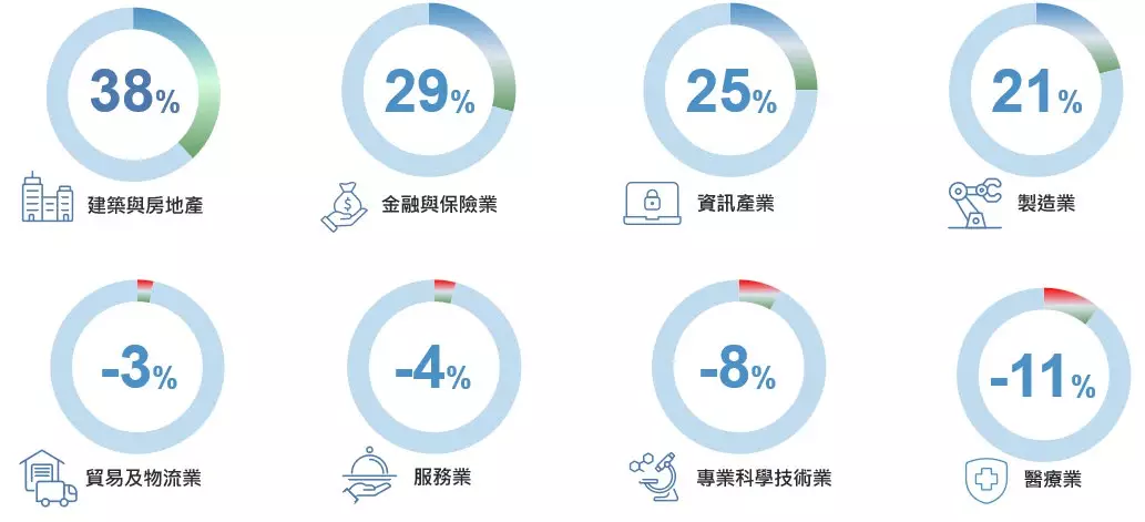 按行業劃分,建築與房地產業的就業展望指數最高,錄得+38%。金融與保險業、資訊產業及製造業亦錄得正面指數,分別為+29%、+25%及+21%。