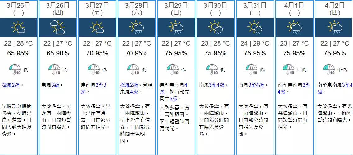 預料一道低壓槽會在下周初至中期為華南地區帶來不穩定天氣。根據九天天氣預報,由本周六(28日)起至下周四(4月2日),一連6日天氣大致多雲,並有一兩陣或幾陣驟雨。未來九日氣温介乎22度至29度,濕度則維持在65%至95%之間。