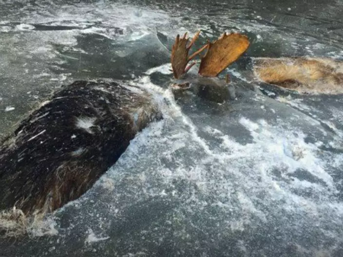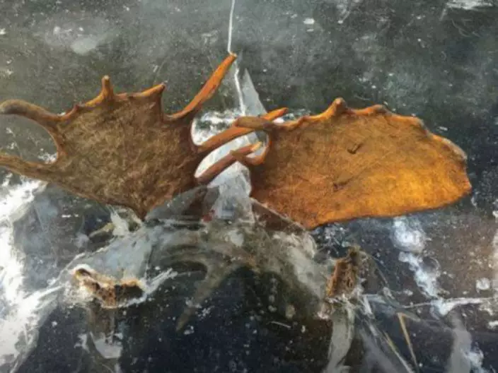 麋鹿的遺體被冰封在20公分厚的冰底下,而打鬥時交纏的鹿角,就這樣被冰封定格。韋伯斯特表示:「我聽說過動物會發生這樣的事,但從來沒有親眼看過」。他的友人艾瑞克森(Jeff Erickson)13日將照片分享到網上,並提到就連當地耆老都沒見過這種奇景。