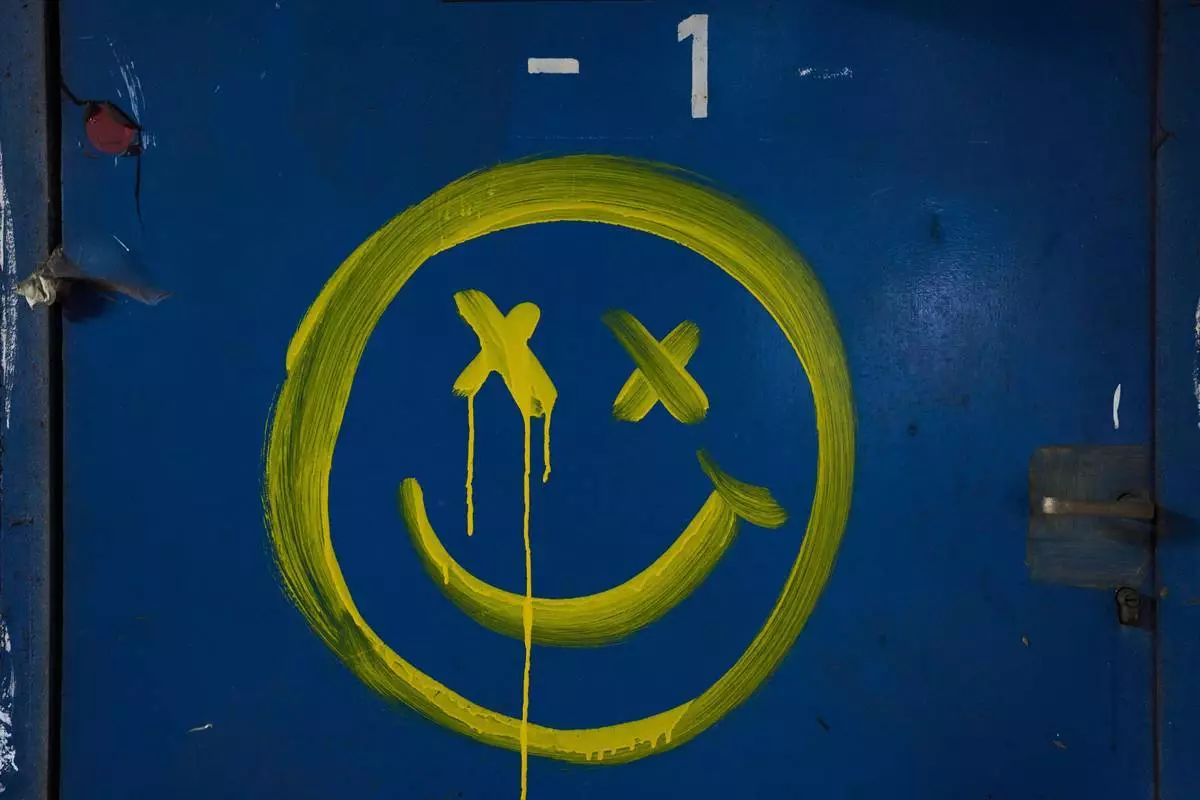 2026年3月12日周四,特拉維夫(Tel Aviv)中央巴士總站下方一道藍牆上繪有笑臉,該處被用作防範伊朗(Iran)可能導彈襲擊的避難所。(美聯社圖片/Oded Balilty) AP圖片