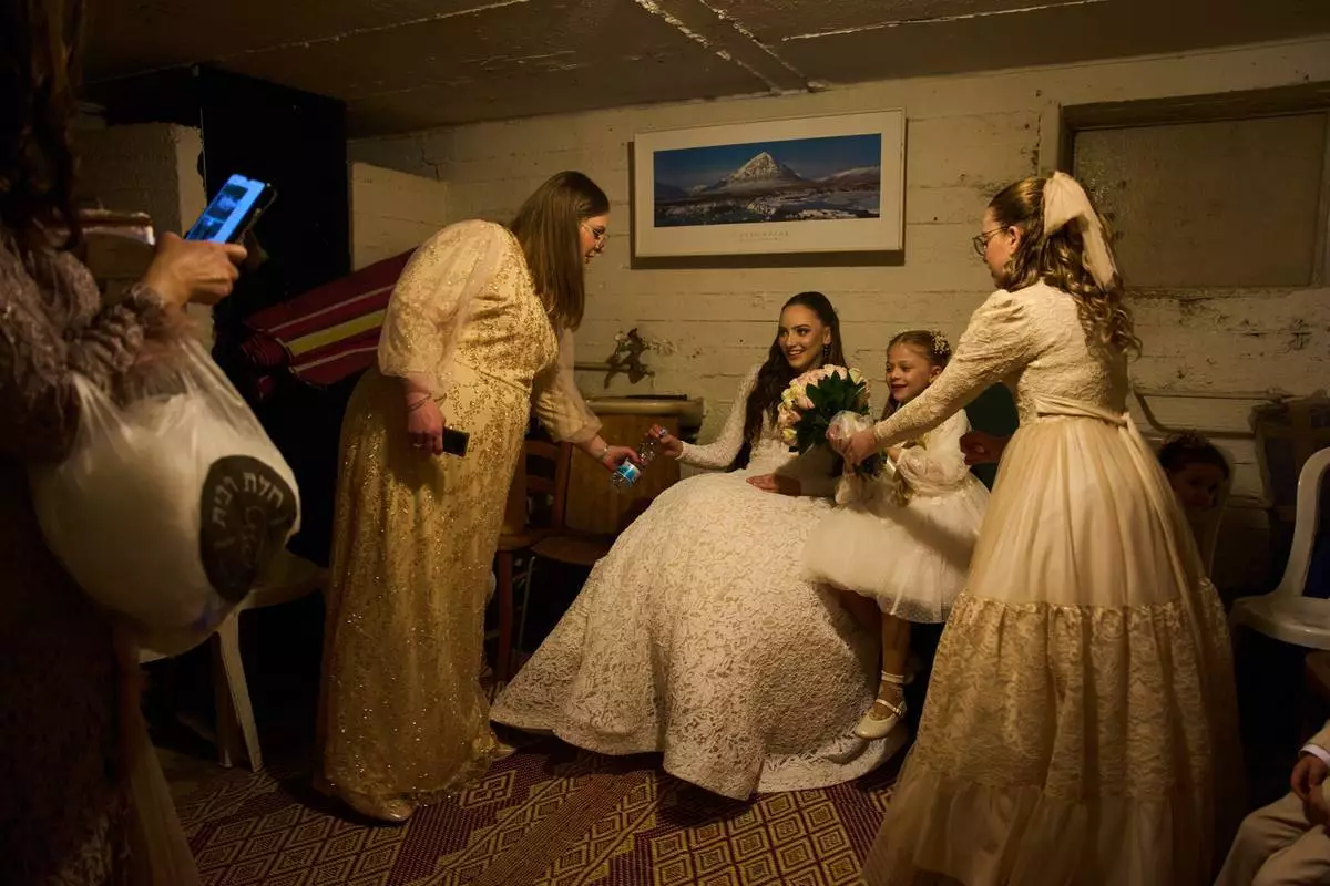 2026年3月19日周四,以色列拉馬特甘(Ramat Gan)一個防空洞內,一名新娘與家人坐著,此前警報警告伊朗(Iran)向以色列中部發射導彈,打斷了他們在附近公園的婚紗照拍攝。(美聯社圖片/Oded Balilty) AP圖片