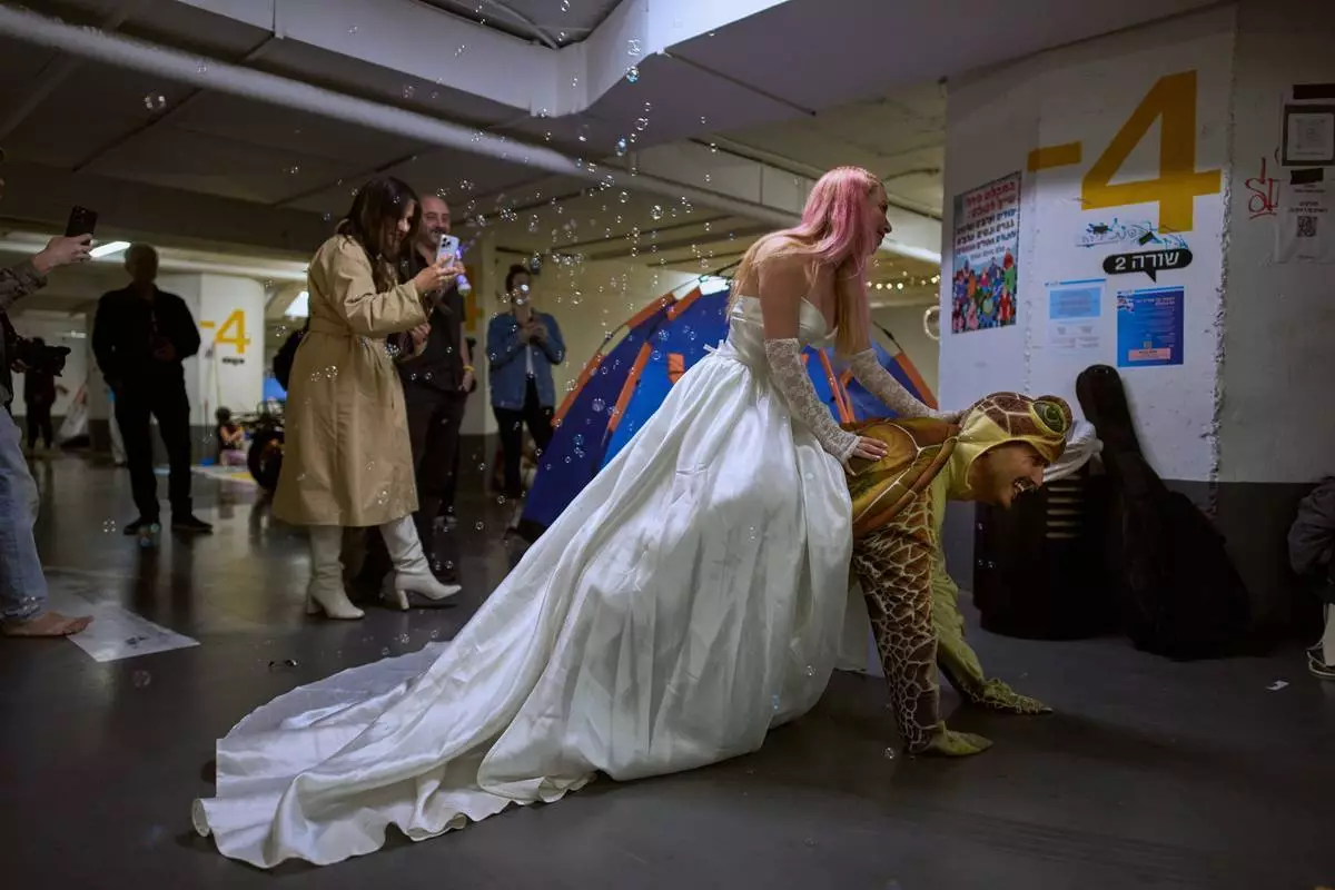 2026年3月17日周二,以色列特拉維夫(Tel Aviv)一個地下停車場內,一名打扮成新娘的女子,在單身活動中騎在一名打扮成烏龜的男子背上,該處被用作防範伊朗(Iran)可能導彈襲擊的避難所。(美聯社圖片/Oded Balilty) AP圖片
