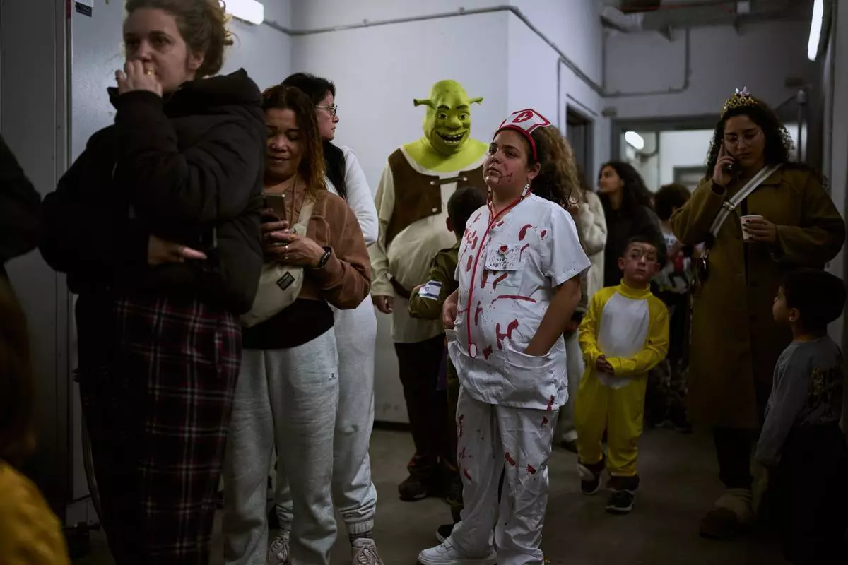 2026年3月2日周一,在猶太教節日普珥節(Purim)期間,以色列拉馬特甘(Ramat Gan)一個用作避難所的地下地鐵站內,人們聚集在一起,部分人穿著節日服裝,以防範伊朗(Iran)可能發動的導彈襲擊。(美聯社圖片/Oded Balilty) AP圖片