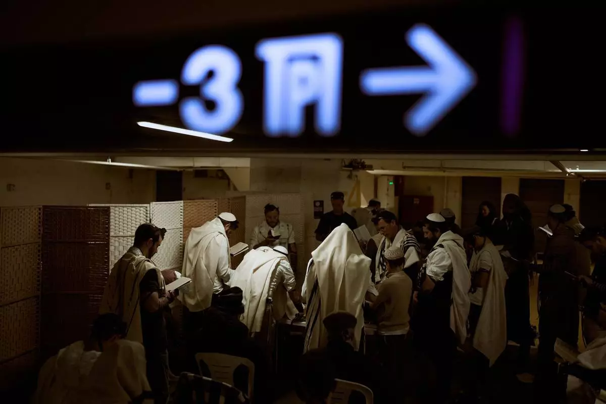 2026年3月3日周二,以色列特拉維夫(Tel Aviv)一個地下停車場內,身披祈禱披肩的猶太男子正在祈禱,該處被用作防範伊朗(Iran)可能導彈襲擊的避難所。(美聯社圖片/Oded Balilty) AP圖片