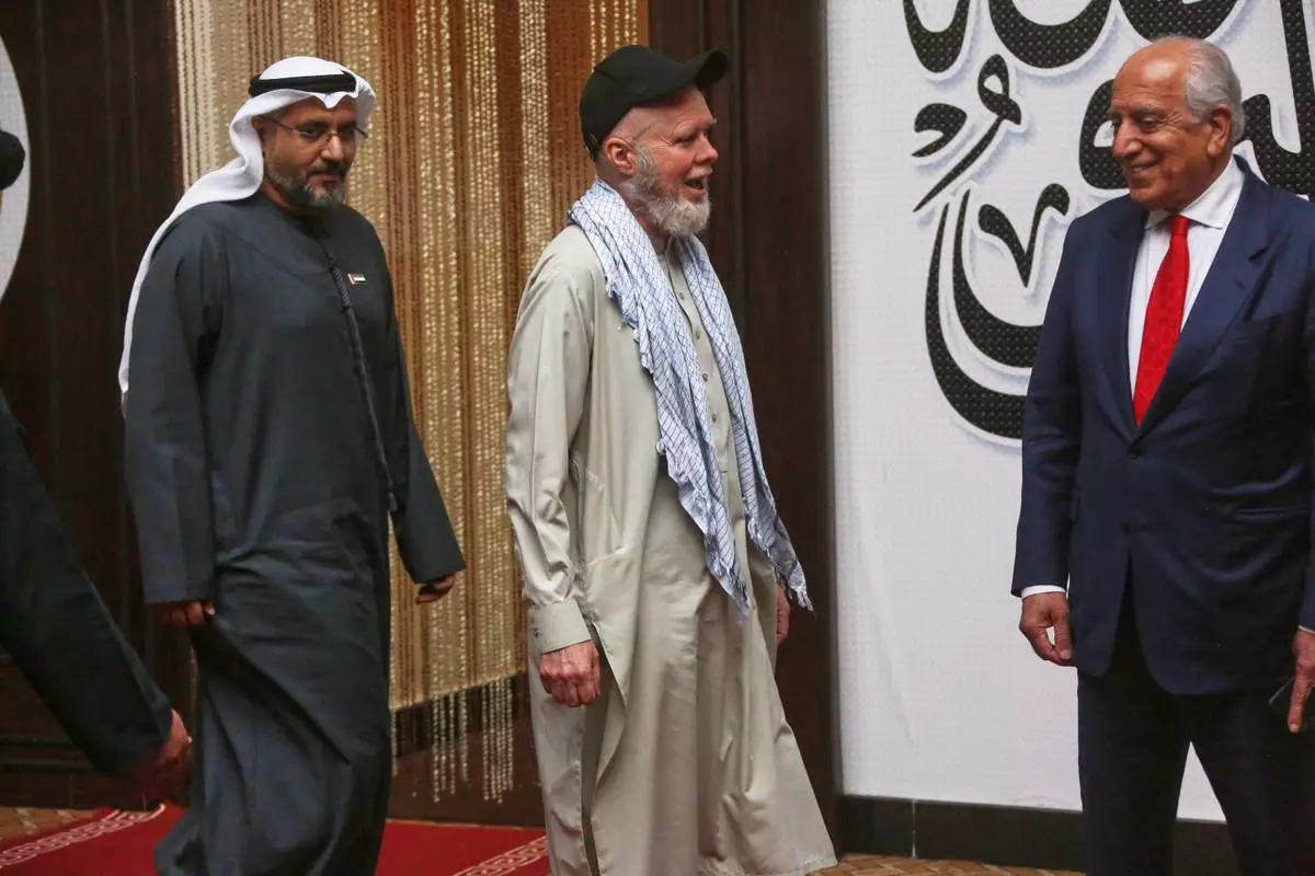 美國阿富汗問題特別代表扎爾邁哈利勒扎德(右)及阿拉伯聯合酋長國駐喀布爾大使賽義夫阿爾凱特比(左)陪同下,美國公民丹尼斯科伊爾(中)在喀布爾機場登機前微笑。AP圖片