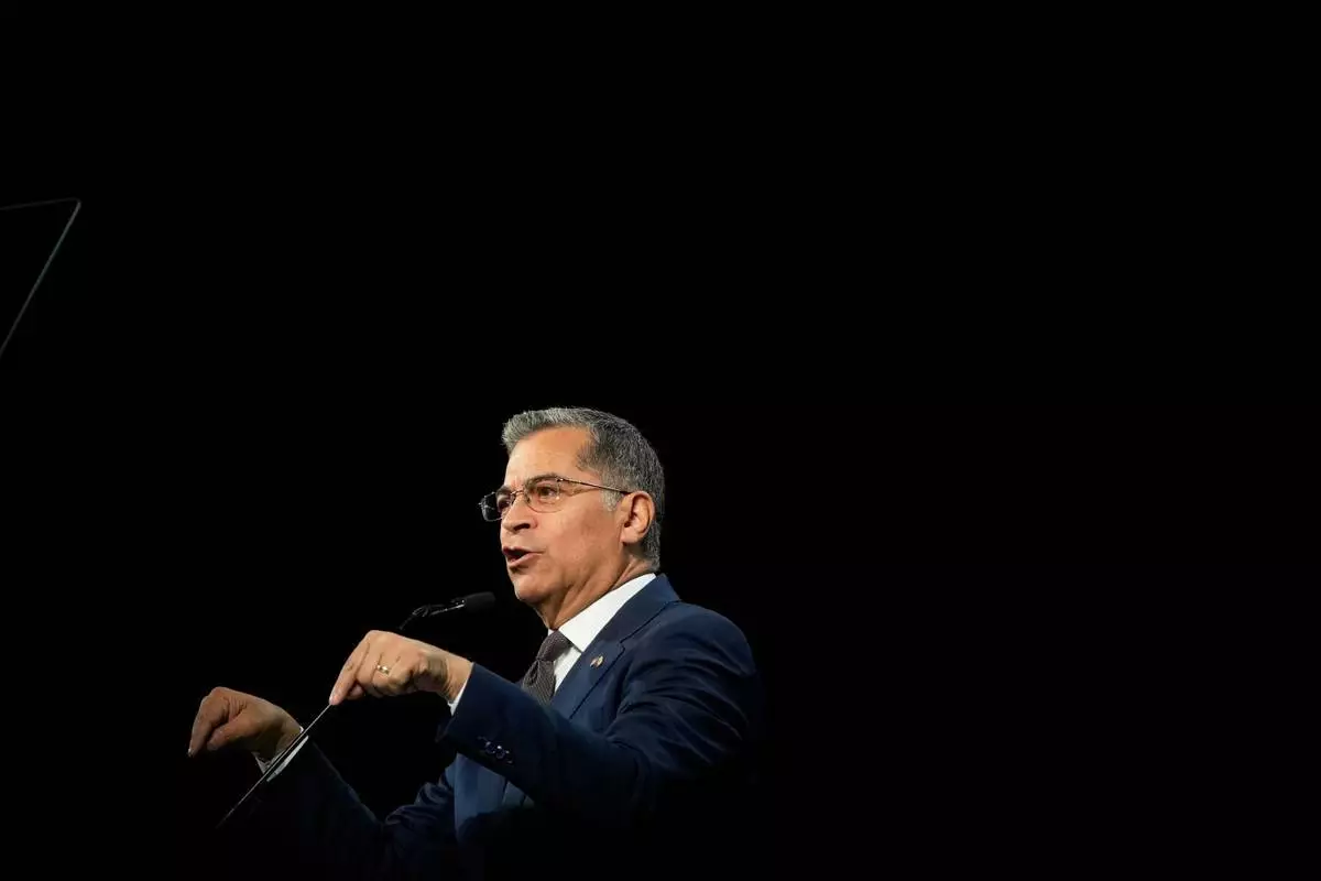 檔案圖片:加州州長候選人薩維爾貝塞拉(Xavier Becerra)於2026年2月21日(周六)在三藩市(San Francisco)舉行的加州民主黨州代表大會上發言。(美聯社圖片/Jeff Chiu) AP圖片