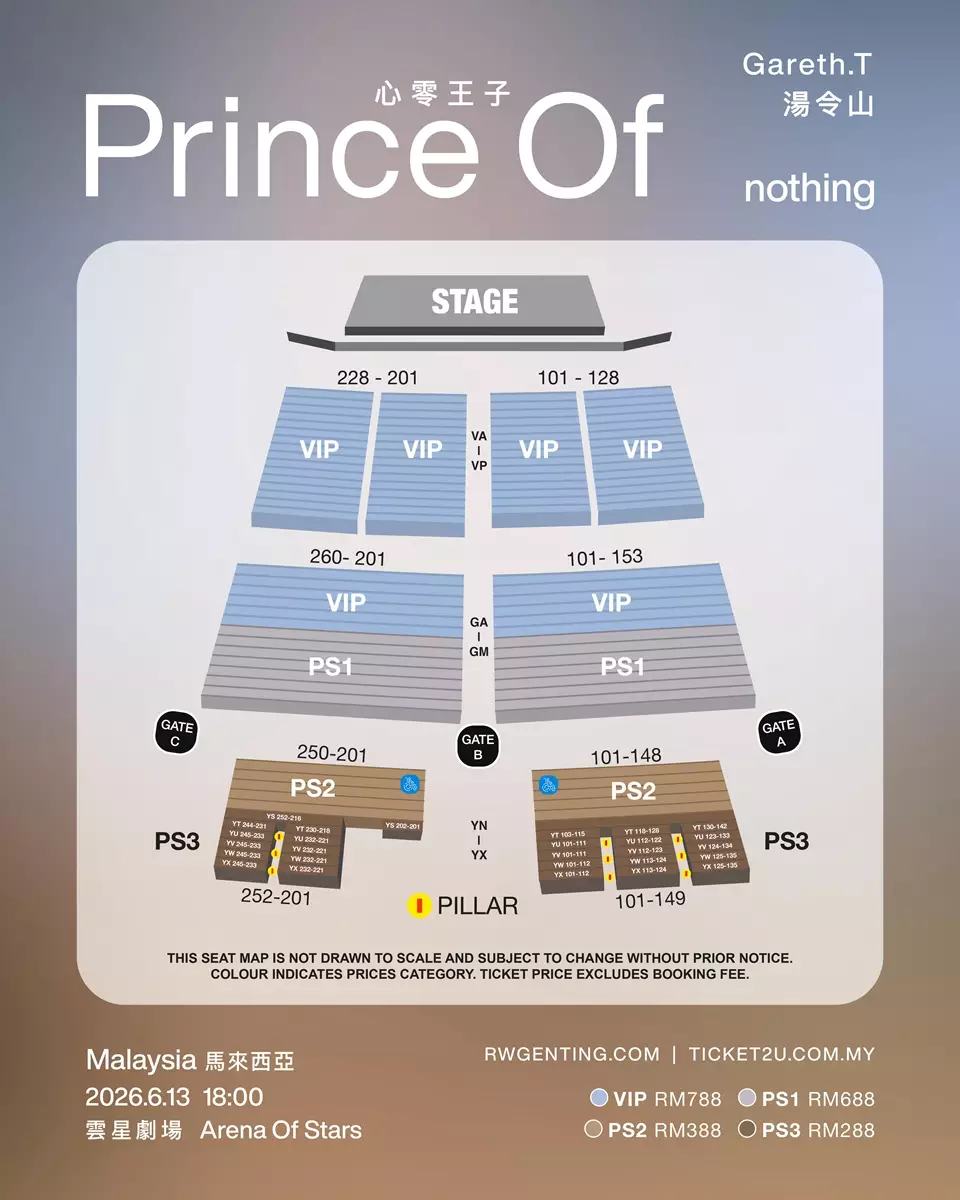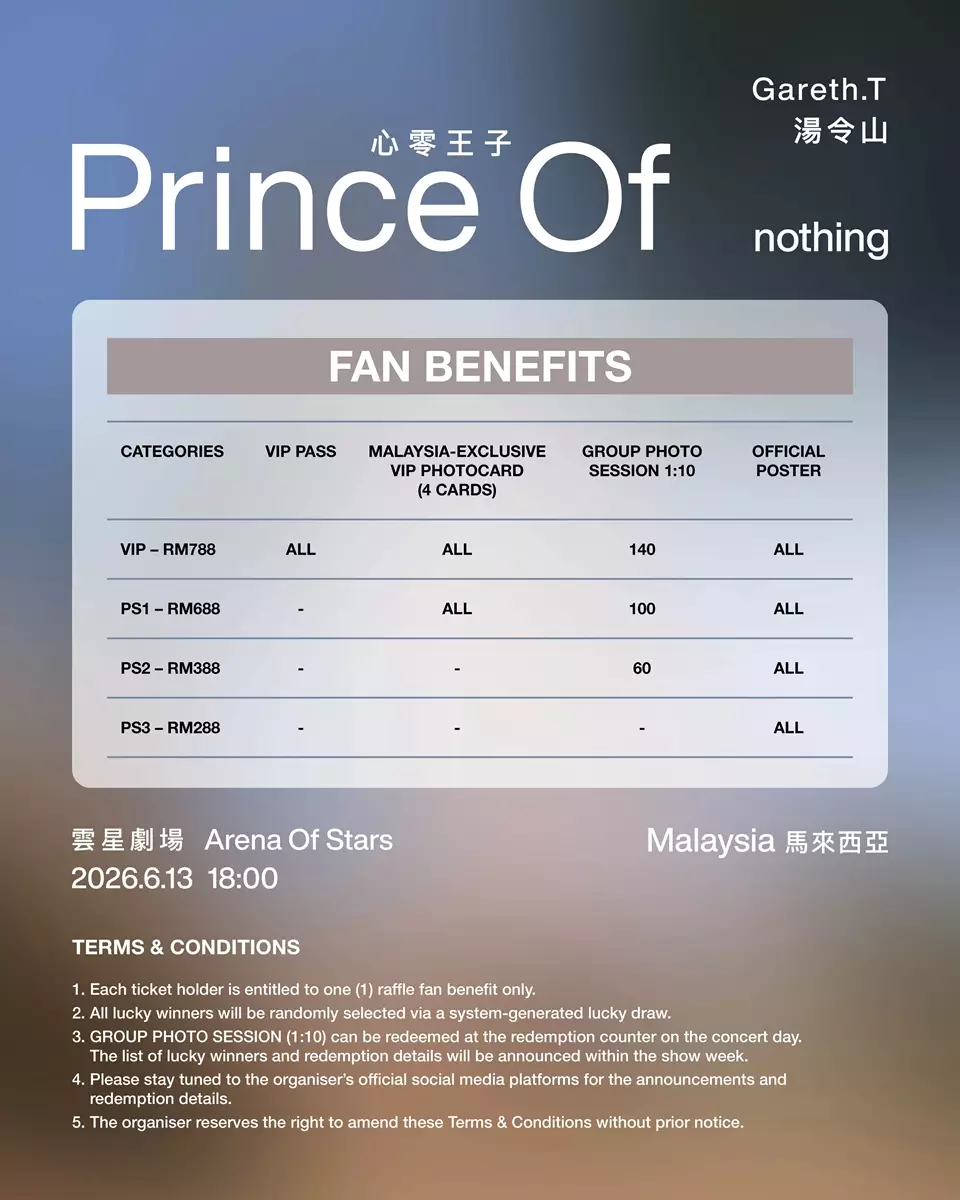 馬來西亞站正式公布後,當地知名網紅歌手大穎不但公開表達對Gareth.T的喜愛,更因無法出席Gareth.T馬來西亞站而在社交平台直白表示心碎,令Gareth.T的網絡熱度火速被推高,演唱會消息被不停轉發。足見馬來西亞樂迷期待見證,這位從華麗舞台走向樸素自然,從擁抱悲傷到放下執念的Gareth.T,將這份「零」的灑脫如何透過《Prince Of nothing》傳遞與悲傷正式道別的訊息,展開重生與自我對話。更多演出詳情及售票資訊如下: