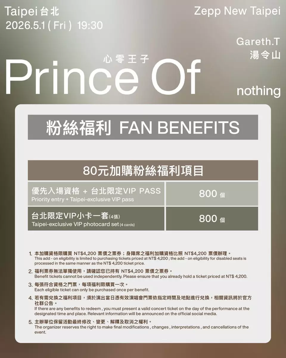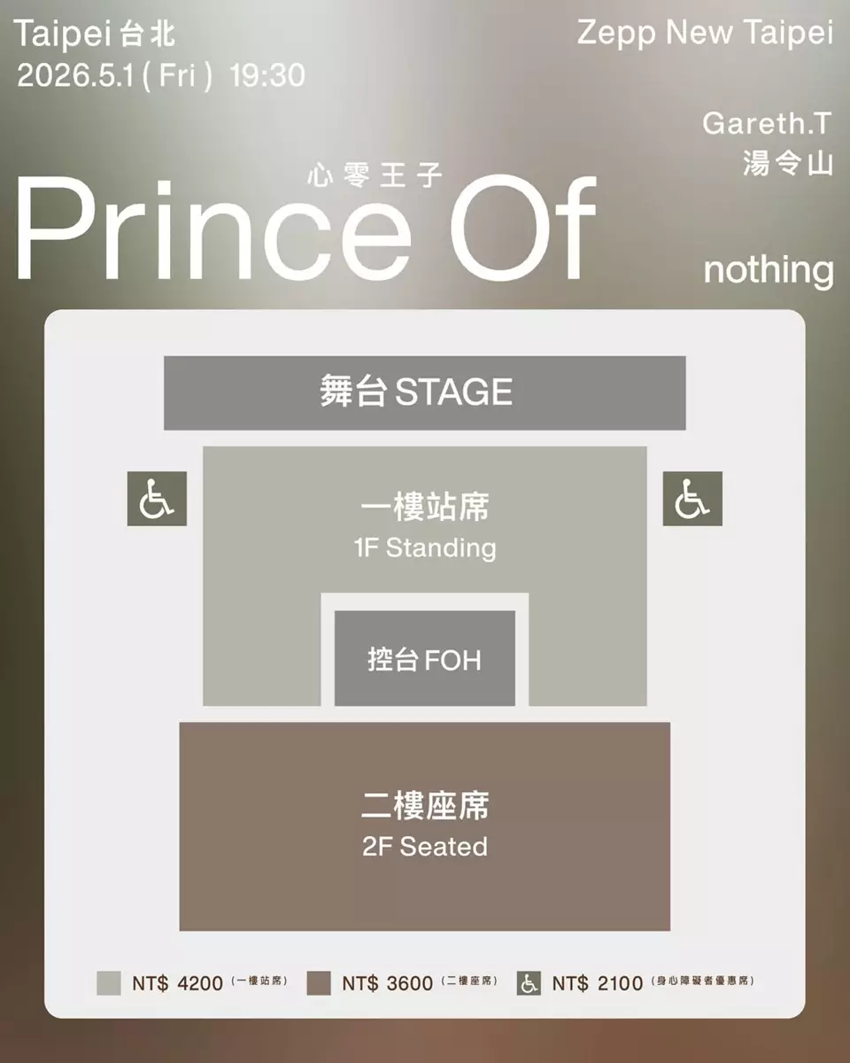 去年以「心傷王子」治癒無數樂迷的Gareth.T湯令山,宣告啟動全新概念巡演《Prince Of nothing》,並一口氣公布台北與馬來西亞兩站場次!繼2025年《Prince Of Sadness》世界巡演由倫敦啟航、最終在澳門劃下句點後,Gareth.T 經歷情感洗鍊,將以「心零」姿態帶來更深層的音樂蛻變。台北站確定於2026年5月1日登陸Zepp New Taipei,門票現已公開發售;馬來西亞站則在同年6月13日於雲頂世界雲星劇場震撼開唱。兩地樂迷將有機會親身見證他從華麗悲傷走向樸實灑脫的成長軌跡。