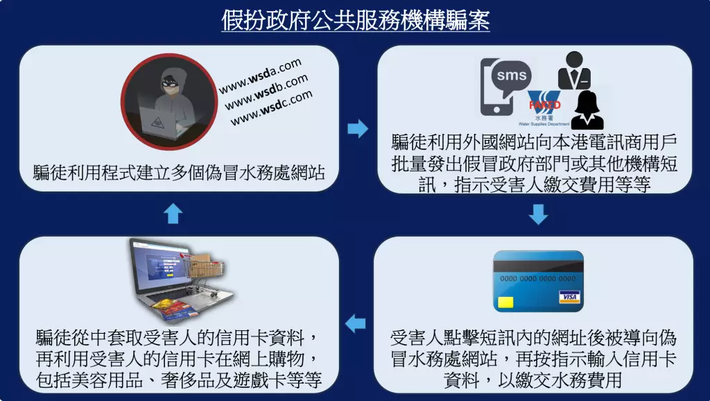 港島總區科技及財富罪案組高級督察徐蔚瑩表示,該集團犯案手法具高度組織性。集團成員會假冒水務署名義,向市民發送附有虛假連結的短訊,聲稱需處理帳戶事宜或逾期帳單。當受害人點擊連結並在偽冒網站輸入信用卡資料後,集團便會即時利用該資料,在本地不同網上商店進行大額購物,購買包括名牌手錶、演唱會門票及具炒賣價值的遊戲卡等物品。為逃避追查,集團會將貨物配送至不同智能櫃或零售店舖,再派人提取。