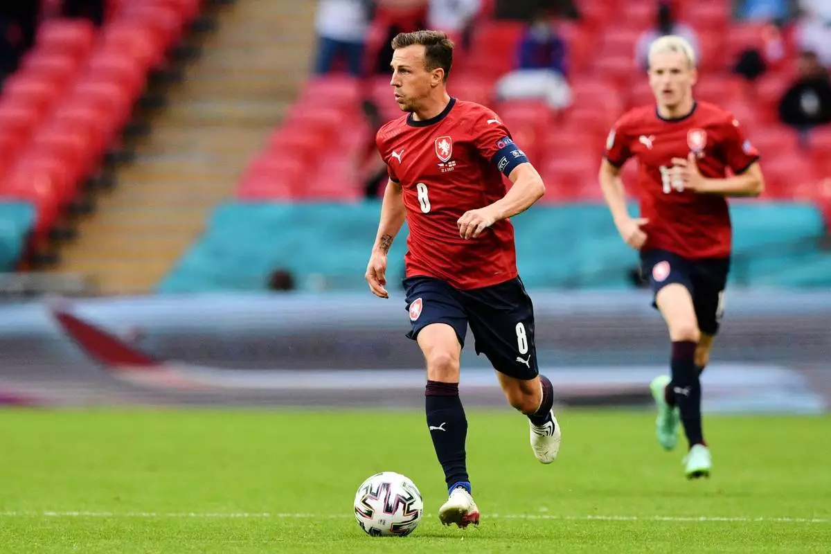 (美聯社圖片/Justin Tallis/Pool Photo via AP, File) 捷克球員華拉迪米爾·達里達(Vladimír Darida)於2021年6月22日周二,在倫敦(London)溫布萊球場(Wembley stadium)一場2020年歐洲國家盃D組捷克對英格蘭(England)的足球賽中盤球。 AP圖片
