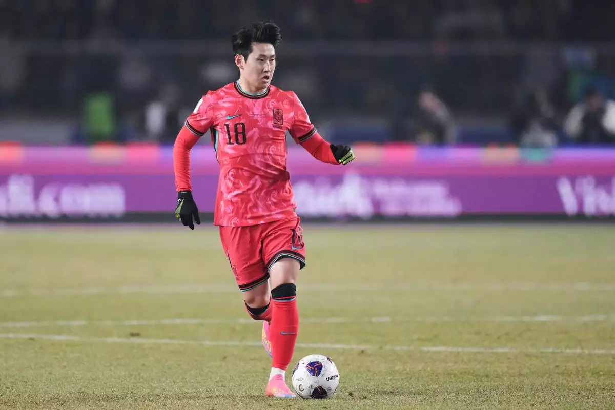 (美聯社圖片/Lee Jin-man, File) 南韓球員李康仁(Lee Kang-in)於2025年3月20日周四,在南韓高陽(Goyang)一場對阿曼(Oman)的世界盃外圍賽中盤球。 AP圖片