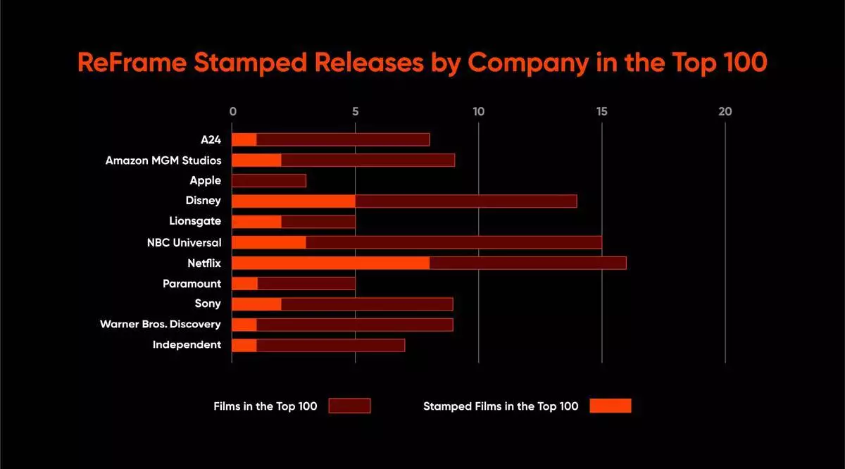 ReFrame報告包含一份成績單,顯示每間公司達到ReFrame認證標準的百大電影百分比。今年,只有Netflix的發行作品中至少有五成獲得ReFrame認證,而蘋果公司(Apple)則連續第三年沒有任何獲認證的電影進入百大名單。