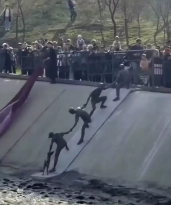 小狗墮水庫受困獲民眾築人鏈救援,當地時隔10年後設立雕像重現當日情景宣揚團結精神。網上圖片