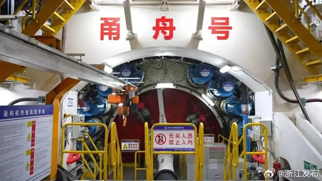 金塘海底隧道位於浙江寧波北侖區與舟山金塘鎮之間,穿越繁忙的金塘水道,最大埋深達78米,需要承受極高水壓與複雜地質考驗,被形容是一場「深海技術極限秀」。工程採用兩台超大直徑盾構機「甬舟號」與「定海號」,分別從寧波側與舟山側同時始發,相向掘進,預計於2026年年底在海底精準對接「會師」。