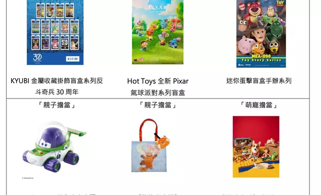 • 驚喜擔當:盲盒大晒冷 – 超過 40 款盲盒系列,更有 Hot Toys 全新 Pixar 氣球派對系列盲盒;慶祝《反斗奇兵》30 周年 KYUBI 推出的金屬收藏掛飾盲盒系列;及《玩轉腦朋友》繽紛心情盲盒手錶等