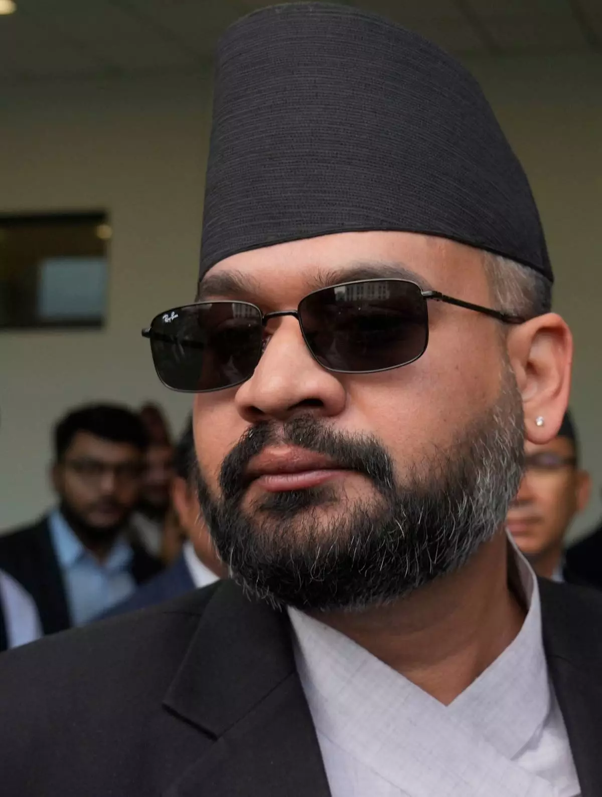 2026年3月26日周四,戴著太陽眼鏡的巴連德拉沙(中)抵達尼泊爾加德滿都的聯邦議會,出席新當選眾議院議員的宣誓就職儀式。(美聯社圖片/Niranjan Shrestha) AP圖片