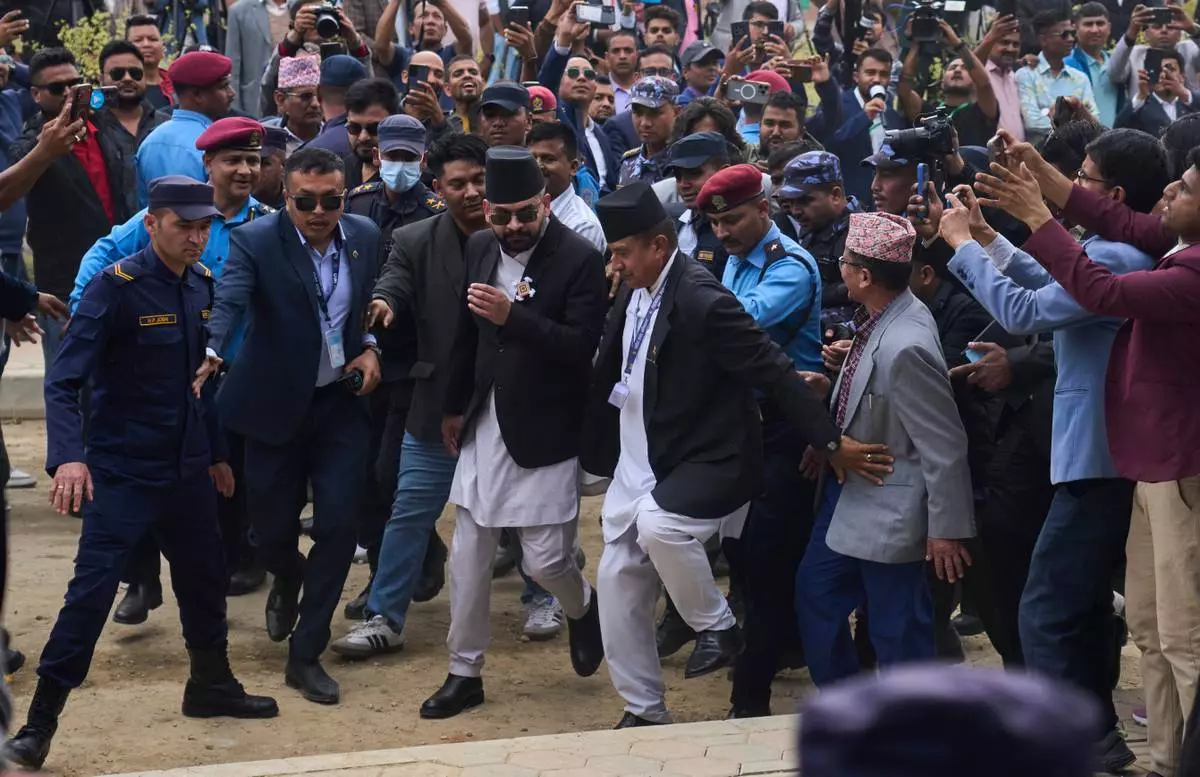 2026年3月26日周四,巴連德拉沙抵達尼泊爾加德滿都的聯邦議會,出席新當選眾議院議員的宣誓就職儀式。(美聯社圖片/Niranjan Shrestha) AP圖片