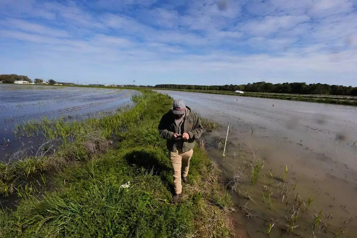 科林勞森(Colin Lawson)走過他家族在路易斯安那州克勞利的小龍蝦池塘之間,2026年3月19日周四。(美聯社圖片/Gerald Herbert) AP圖片