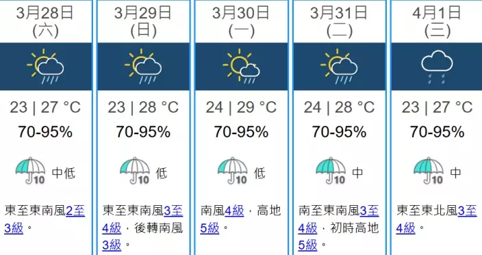 本港未來數天都有驟雨,氣溫最高29度。天文台網站