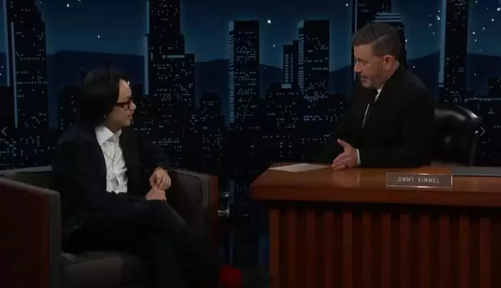 Jimmy Kimmel指歐陽萬成坐了13小時飛機,從香港返回美國,並問對方回來的航班是否順利。歐陽萬成表示,他在香港停留了一個星期宣傳新片,沒有意識到自己要回到美國這個「一片混亂」(dumpster fire)的國度。