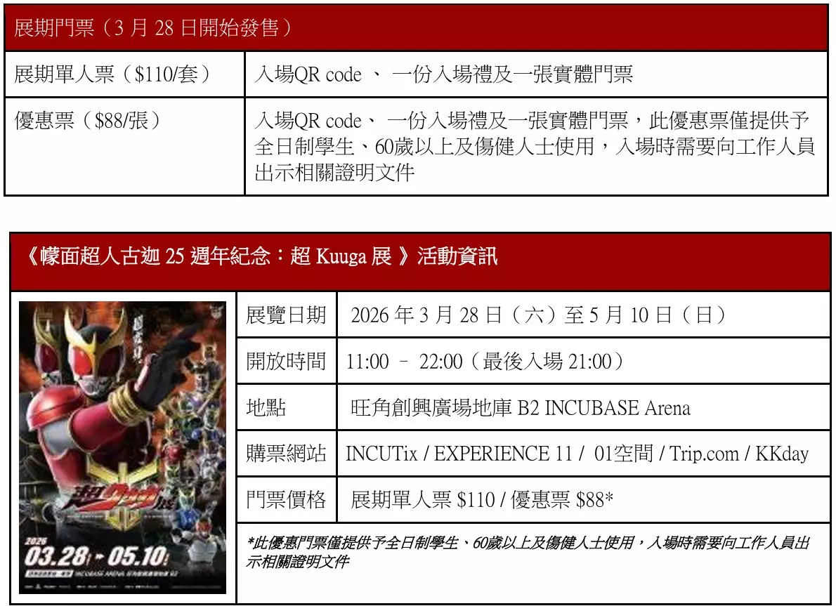 「大家的笑容由我來守護!」—— 為慶祝特攝經典《幪面超人古迦》播映 25 週年,由 INCUBASE Studio 《幪面超人古迦 25 週年紀念:超 Kuuga 展》於旺角 INCUBASE Arena 隆重揭幕,香港作為 2026 年海外巡迴首站震撼登場。香港站展期為 3 月 28 日至 5 月 10 日,展覽將會首次公開平成首位英雄誕生的秘辛及揭示特攝新紀元的製作內幕,高度還原作品中令人屏息的戰鬥瞬間,帶領觀眾重新感受「從零開始的時代」,期待大家親臨展覽現場,共同見證這部開創特攝新紀元的不朽傳奇篇章。