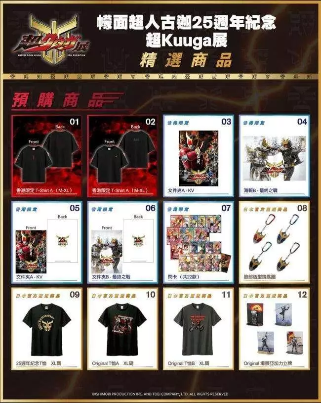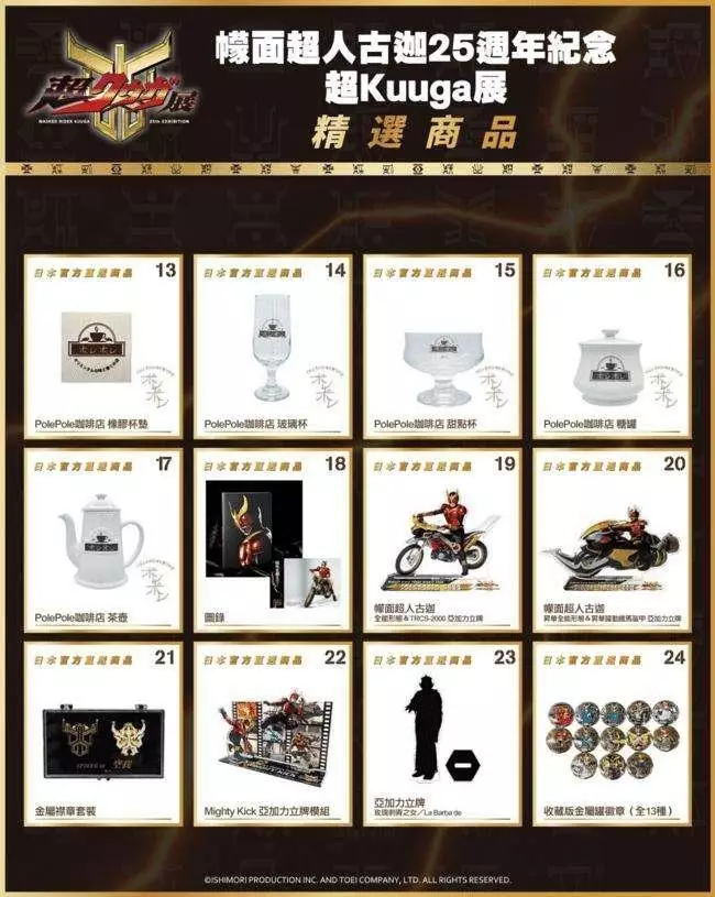 驚喜不止於展覽。展覽特設期間限定店現場發售多款精選商品,收藏迷必搶日本直送限定、研究古迦設定的百科全書《超Kuuga展》珍貴圖錄、震撼視覺的「古迦馬賽克藝術海報(A2尺寸)」、劇集內咖啡店用品,以及人氣反派角色「玫瑰刺青之女/La Barba de」《超Kuuga展》亞加力立牌。