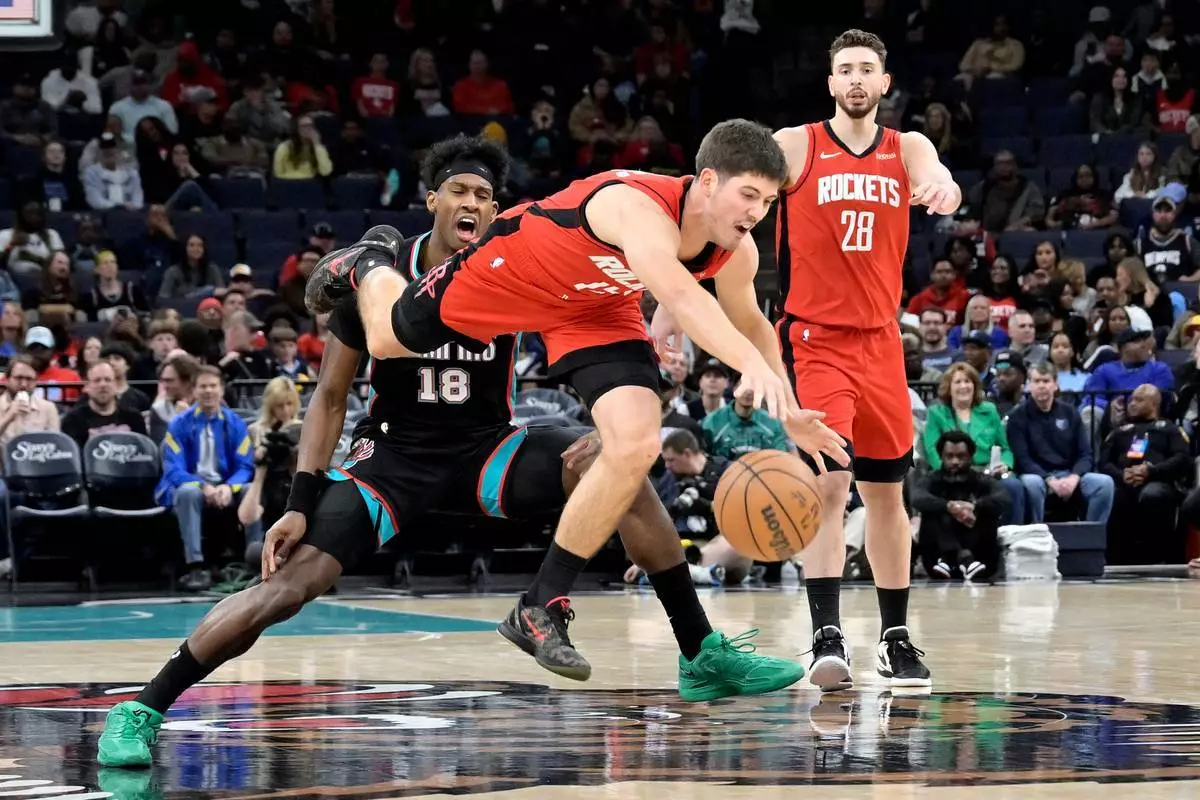 2026年3月27日周五於田納西州孟菲斯舉行的一場NBA籃球賽上半場,侯斯頓火箭後衛列特舒柏特(中)在孟菲斯灰熊前鋒奧利華麥斯辛斯普羅斯珀(18號)和中鋒阿爾佩倫申京(28號)前撲向籃球。(美聯社圖片/Brandon Dill) AP圖片