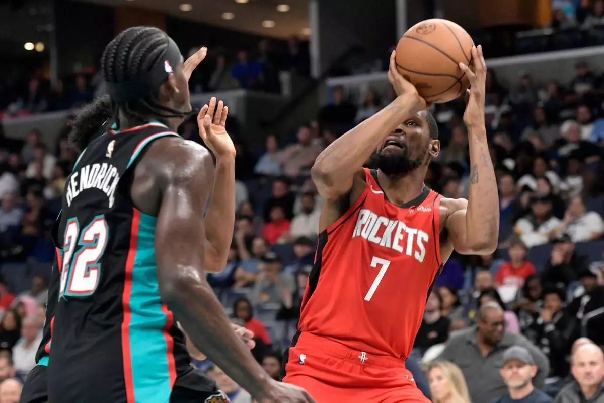 美國田納西州孟菲斯消息,NBA球星杜蘭特(Kevin Durant)周五晚攻入25分,帶領侯斯頓火箭(Houston Rockets)在第四節發力,最終以119:109擊敗孟菲斯灰熊(Memphis Grizzlies)。