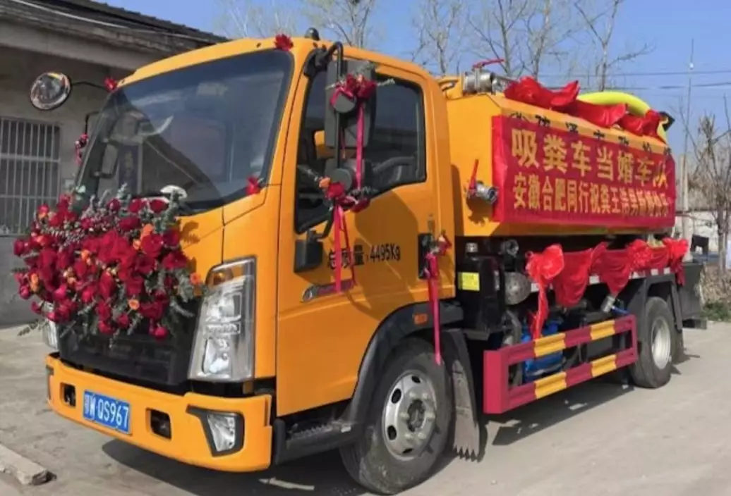 3月27日,張先生將兩輛已清洗乾淨的吸糞車駛到淮北,車頭插上鮮花,車身更掛上祝賀橫額,為婚禮增添氣氛。最終,9輛吸糞車加上6輛私家車,組成一支別開生面的婚車隊。整隊車列浩浩蕩蕩,場面相當吸睛。