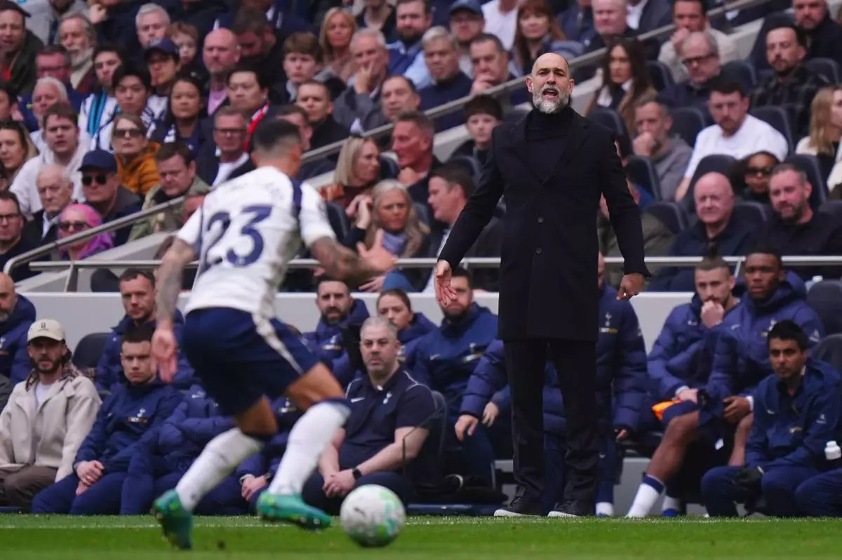 熱刺領隊伊戈爾杜鐸在2026年3月22日周日,於倫敦舉行的英超足球賽事中,對陣諾定咸森林時高聲指示。(Bradley Collyer/PA via AP) AP圖片