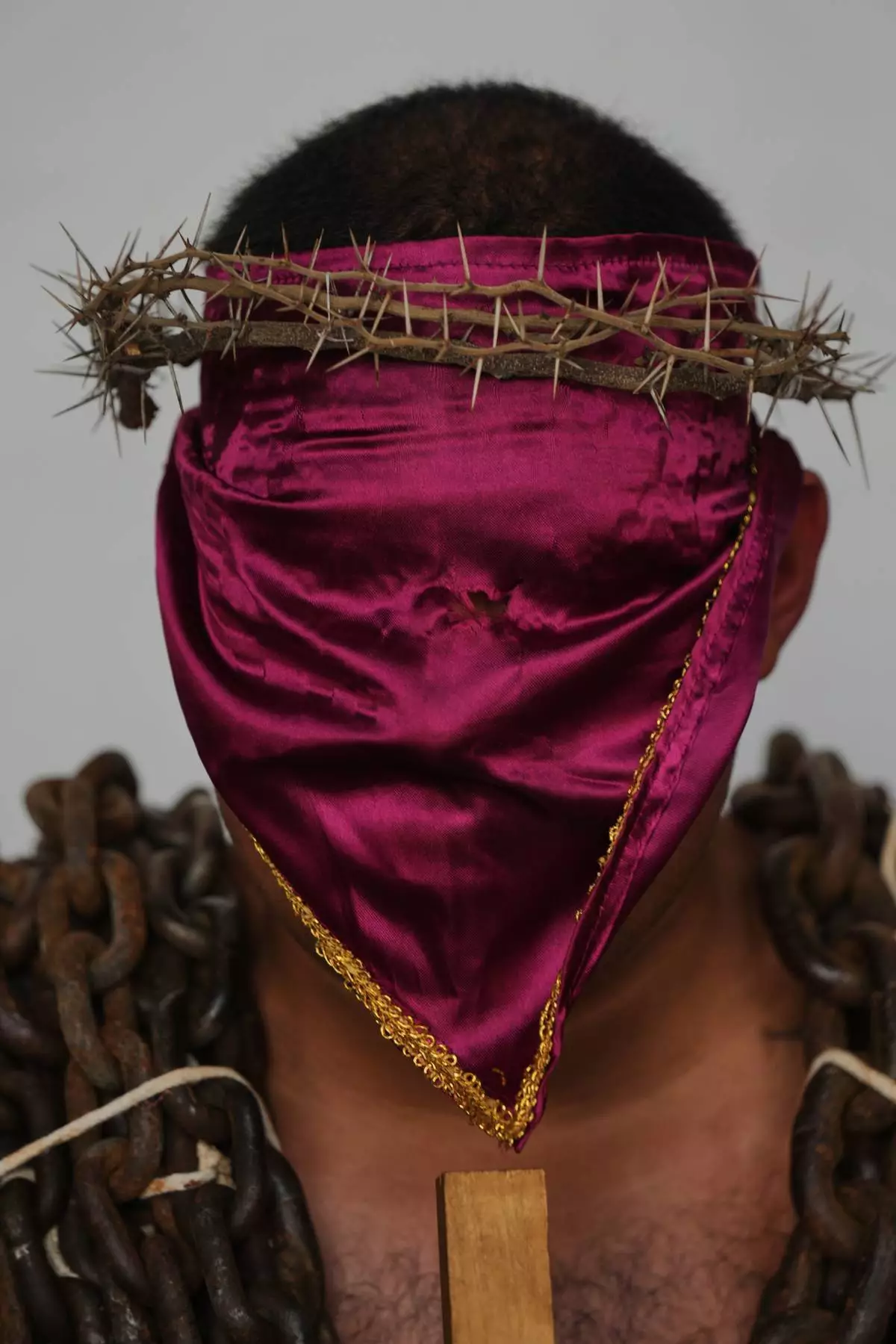 在聖約翰教堂內唱完讚美詩後,班德拉斯身穿傳統的苦行者長袍,米色配深綠色細節,下令啟動花車。花車上載著他所屬兄弟會「淚水與恩惠」(Tears and Favors)的聖母像,由抬轎者扛行。