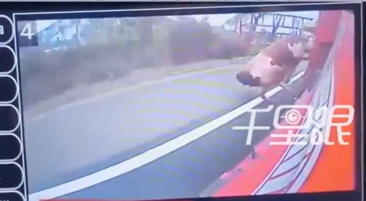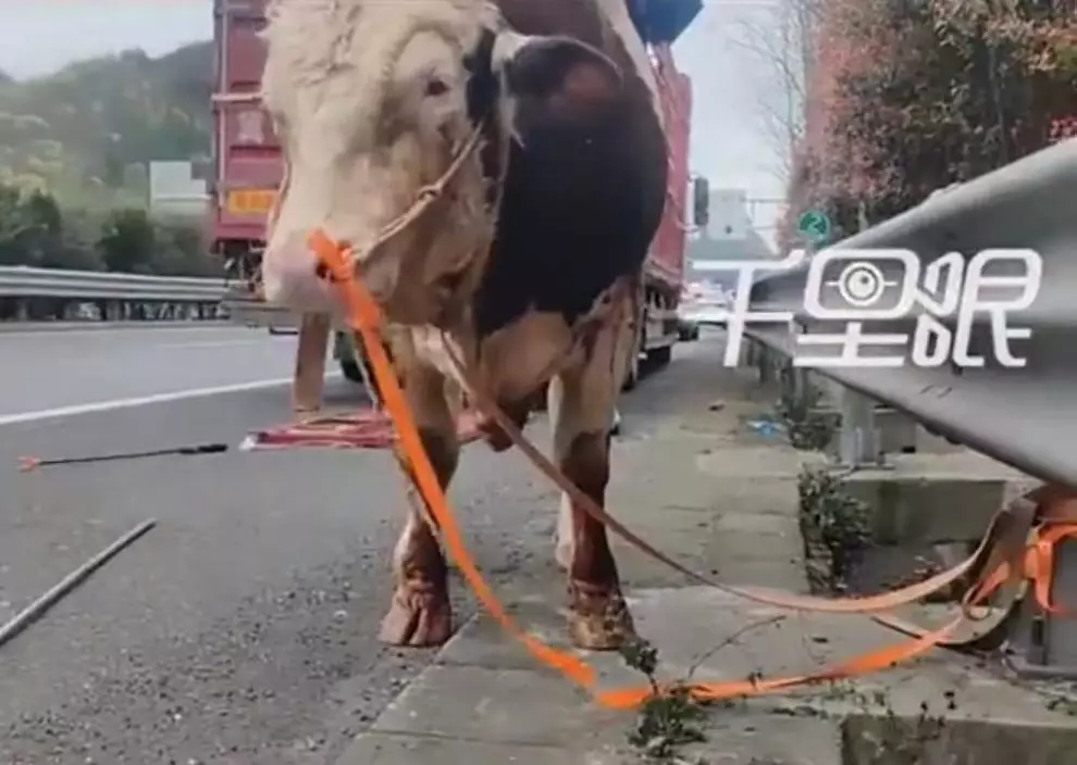 貴州高速驚現牛隻從行駛中的貨車上跳車「越獄」,2頭千斤重壯牛頂斷車廂欄桿墮路面奇蹟無事,車內另外兩頭牛隻反因擠迫或踩踏死亡。