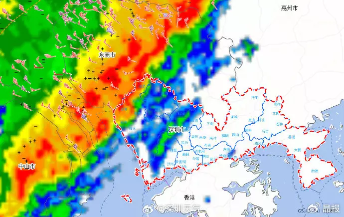 天文台表示,位於珠江口以西的強雷雨區正迅速向東移動,並預料會在未來一兩小時開始影響本港,該區雨勢較大,可能有強烈狂風雷暴及猛烈陣風。市民請提高警惕。
