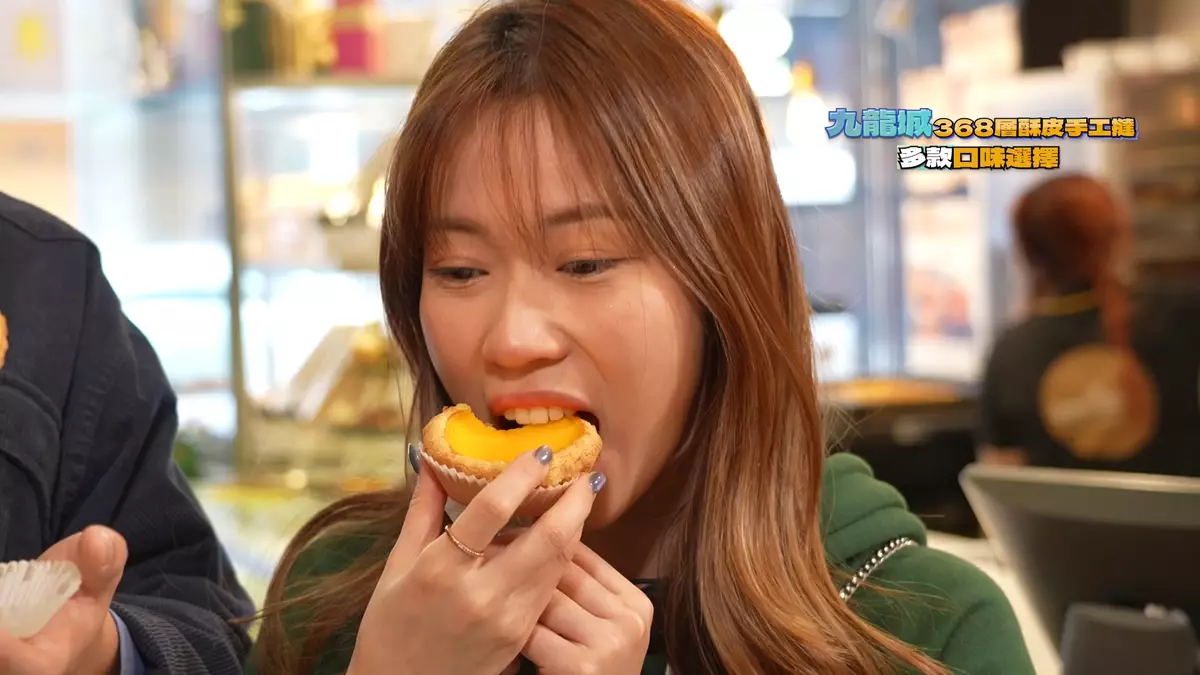 今晚(3月30日)黃婧靈(波波)跟行仔來到九龍城,今次目標並非泰國菜,而是近期網上熱烈討論的酥皮蛋撻,標榜為「非一般的蛋撻」。蛋撻款色繁多除傳統原味外,還有開心果堅果、朱古力及伯爵茶等口味。他們分別選了開心果堅果撻及368層酥皮原味蛋撻,波波說︰「佢哋一日最多試過賣成600幾隻,全部都係師傅自創,我就最想有紫薯味。」他們異口同聲大讚368層酥皮滋味不凡,包含外層脆內層鬆化兩種口感,而蛋香撲鼻而來。行仔自言本來是牛油皮蛋撻支持者,但這款酥皮集牛油皮的香及酥皮的鬆化於一身。